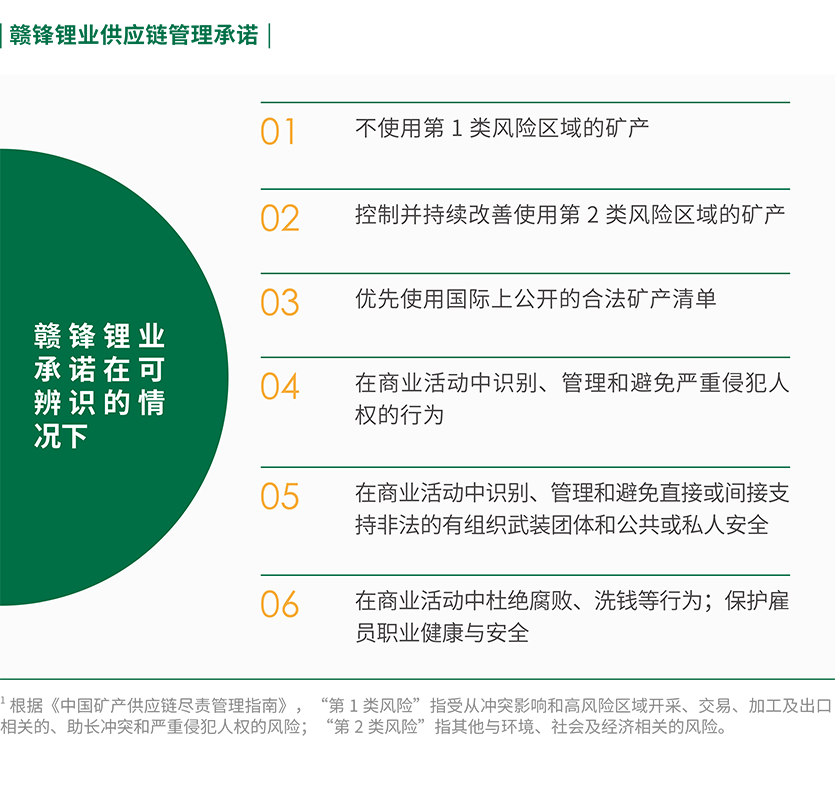 對(duì)于生產(chǎn)過(guò)程中可能涉及的鋰金屬礦產(chǎn)資源使用情況,公司堅(jiān)持道德采購(gòu),承諾不使用來(lái)自沖突地區(qū)的礦產(chǎn)資源,也明確要求供應(yīng)商不得使用來(lái)自沖突地區(qū)及違反公司政策的礦產(chǎn)資源。為處理負(fù)責(zé)任礦產(chǎn)供應(yīng)鏈的風(fēng)險(xiǎn)與隱患,公司常態(tài)化沖突礦產(chǎn)專項(xiàng)管理,并根據(jù)海內(nèi)外業(yè)務(wù)動(dòng)態(tài)不斷進(jìn)行完善。公司經(jīng)營(yíng)人員在澳大利亞、阿根廷、墨西哥、愛爾蘭等地投資參股鋰礦權(quán)項(xiàng)目并擔(dān)任董事,與其簽訂包銷協(xié)議,通過(guò)股權(quán)與包銷協(xié)議的方式,確保礦原材料的來(lái)源、運(yùn)輸路徑明確,達(dá)到風(fēng)險(xiǎn)可控、可追溯的目的。