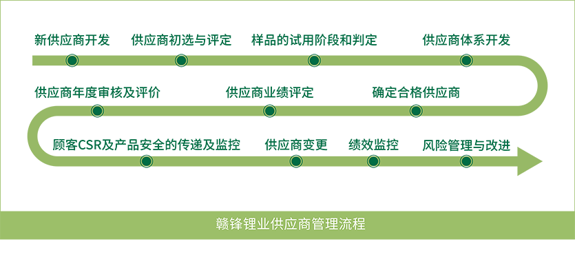 贛鋒鋰業(yè)高度重視鋰供應(yīng)鏈的安全,因?yàn)檫@直接關(guān)系到新能源產(chǎn)業(yè)的發(fā)展。我們將可持續(xù)發(fā)展的理念納入采購(gòu)流程,積極采購(gòu)環(huán)境友好型產(chǎn)品,并制定《供應(yīng)商行為準(zhǔn)則》,從守法經(jīng)營(yíng)、合規(guī)用工、資源消耗、排放控制、健康與安全、商業(yè)道德等方面引導(dǎo)和規(guī)范供應(yīng)商行為。贛鋒鋰業(yè)堅(jiān)持以可持續(xù)發(fā)展為導(dǎo)向的責(zé)任供應(yīng)鏈決策,積極探索責(zé)任供應(yīng)鏈塑造工作,承擔(dān)產(chǎn)業(yè)上下游的責(zé)任傳遞,降低產(chǎn)業(yè)鏈上社會(huì)與環(huán)保風(fēng)險(xiǎn),確保產(chǎn)業(yè)經(jīng)濟(jì)價(jià)值與環(huán)境價(jià)值的雙重實(shí)現(xiàn)。